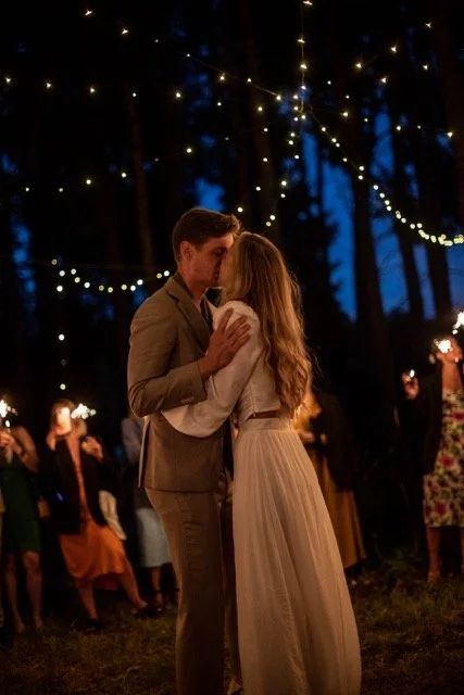 Par som dansar under en stjärnklar natt med ljusslingor och folk som håller fyrverkeripjäser i bakgrunden.