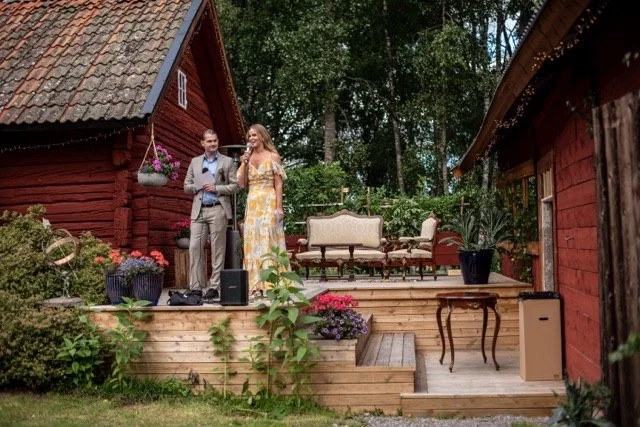 Ett par står på en träveranda omgiven av röda trähus och grönska. Kvinnan håller i en mikrofon. Det finns blommor och utemöbler runt omkring. Verandan har en rustik och lantlig stil.