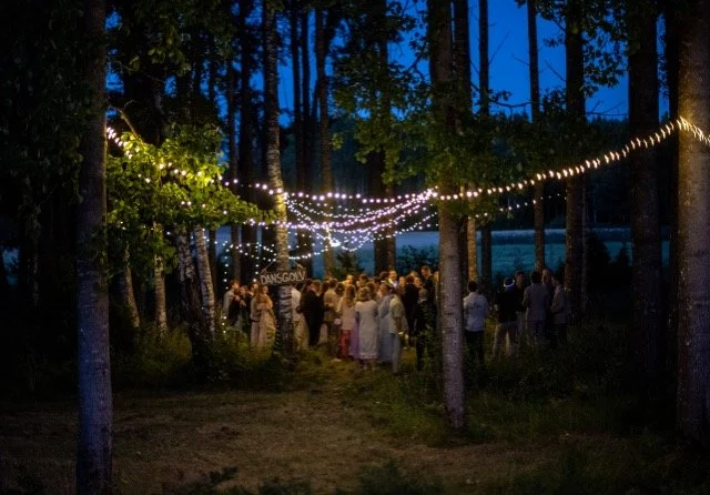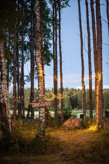 Träd i en skog med ljusslingor och en skylt som säger "Dansgolv". Kvällsbelysning skapar en stämningsfull atmosfär.