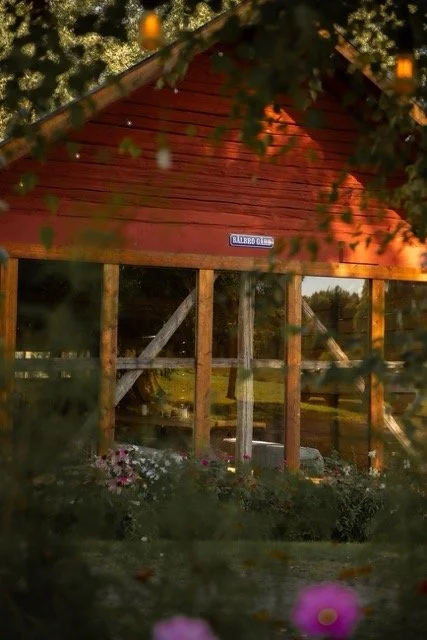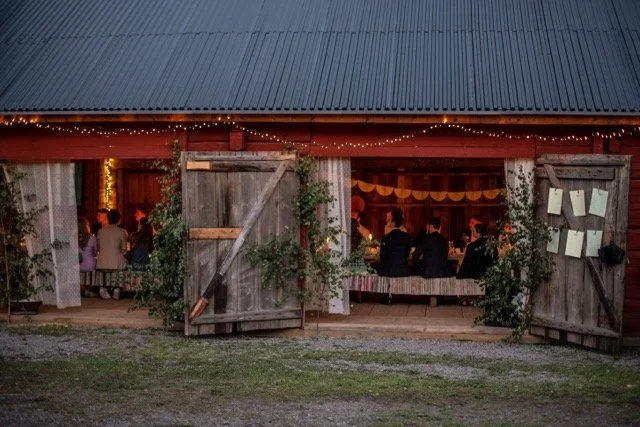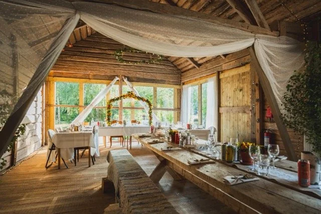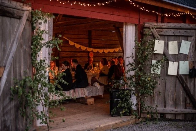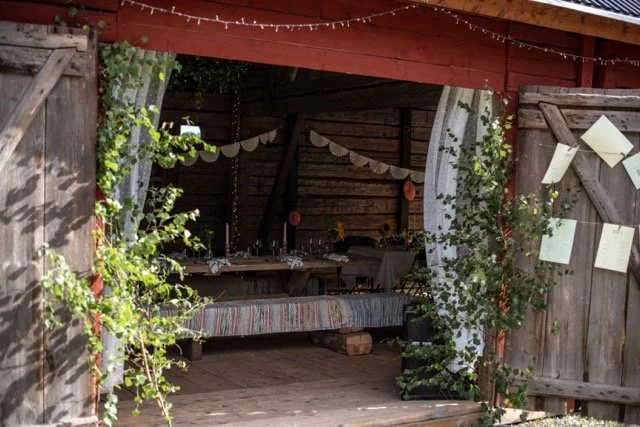 Insida av en ladugård, dekorerad för ett evenemang. Det finns dukade bord med dukar och dekorationer. Väggarna har girlander och det hänger ljusslingor. Växter klättrar på dörrarna.