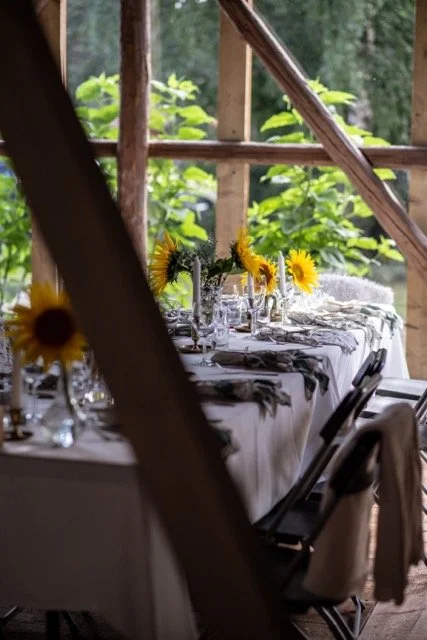 Dukat bord i rustik miljö med solrosor som dekoration, vita dukar och vikta servetter. Gröna växter syns i bakgrunden.