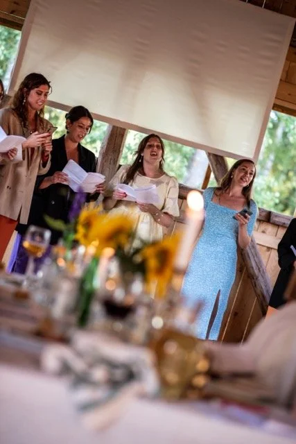 En grupp kvinnor står framför en vit duk och sjunger eller läser från papper. Framför dem syns ett bord med glas, bestick och gula blommor i fokus. Det är en inomhusmiljö med trädetaljer och fönster med grönska utanför.