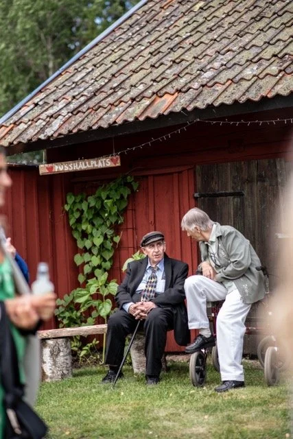 Två äldre män samtalar vid en röd stuga som har en skylt med texten 'Busshållplats'. En man sitter på bänken och den andra står bredvid med stöd av en rullator. Trädgård i bakgrunden.