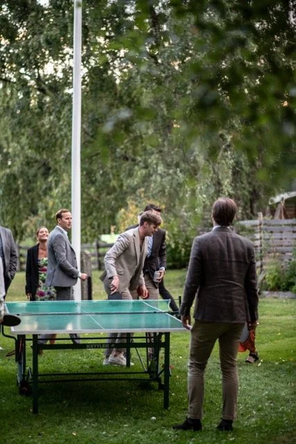 Två personer vid ett pingisbord i en trädgårdsmiljö, omgivna av träd och buskar. I bakgrunden syns fler personer och byggnader i en lantlig miljö.