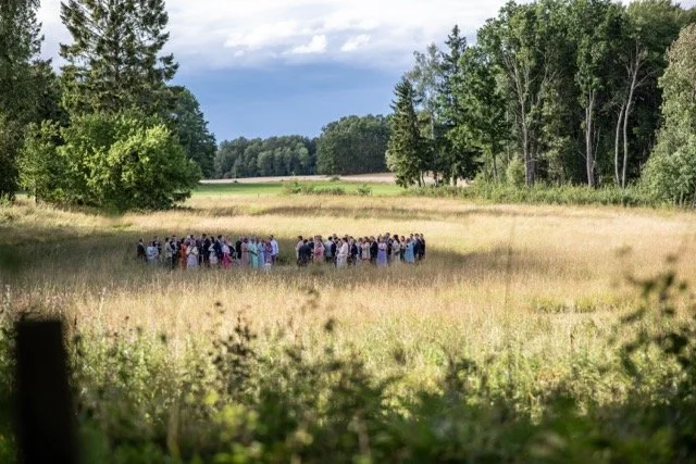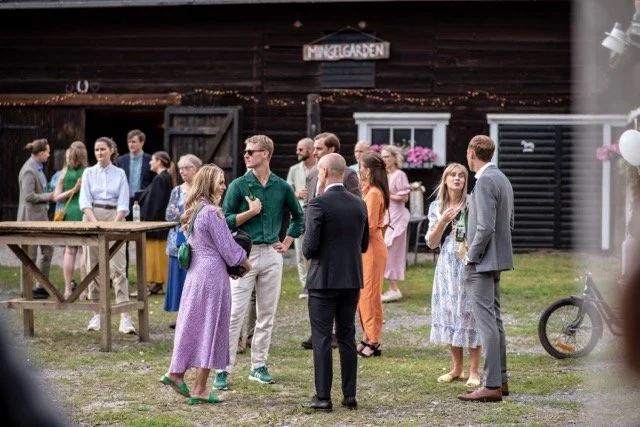 En grupp människor i formell klädsel minglar utomhus framför en rustik byggnad med en skylt som säger "Mingelgården". Det är dagsljus och omgivningen ser ut att vara lantlig. Det finns också en cykel på marken.
