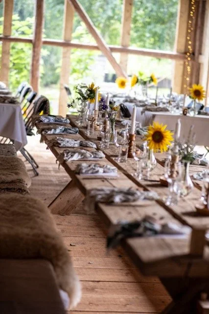 Långbord dekorerat för fest med solrosor, glas och servetter i ett rustikt rum med stora fönster och trägolv.