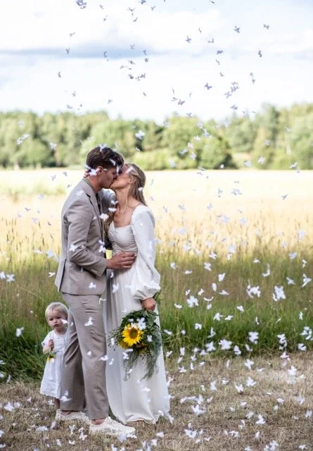 Bröllopspar kysser varandra på en äng, omgivna av blomblad. En liten flicka står bredvid dem, håller i en bukett. Det är soligt och gröna träd syns i bakgrunden.