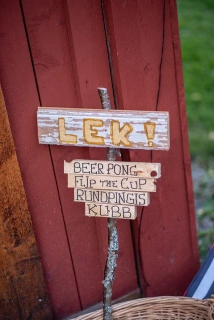 Träskylt med texten "LEK!" och mindre skyltar under med "BEER PONG", "FLIP THE CUP", "RUNDPINGIS", "KUBB". Bakgrund av trävägg och grönska.