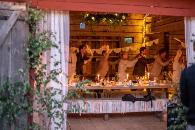 Bröllopsfest i rustik lokal med gäster vid dekorerade bord och vimplar i taket.