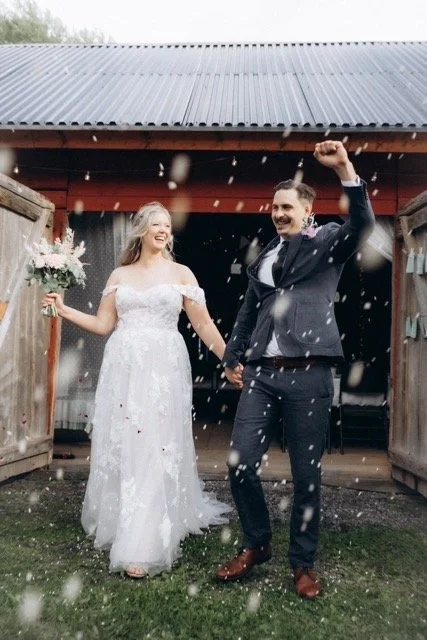 Bröllopspar firar under en glädjande stund, omgivna av blomblad och stående framför en byggnad med öppna dörrar.